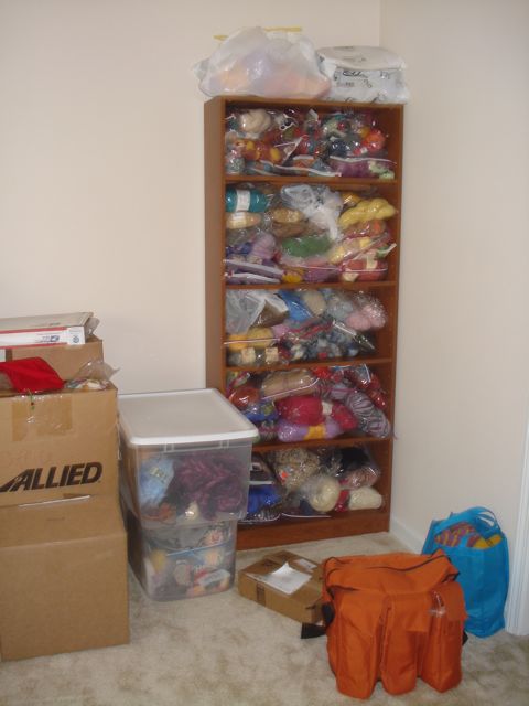 The move last Saturday went really well (according to all the people who had moved substantial households) and now I'm in the sloooooow process of unpacking boxes and finding homes for my stuff. Some days I get really motivated and will tackle whole sections of a room. Other days I just feel plain lazy and maybe get one box done before I have to take a nap. The best part of the new apartment is that it has 2 bedrooms. The second bedroom is the office/music room/yarn storage area. I'm super excited to have a designated space for my yarn. Somehow those boxes managed to get unpacked fairly quickly.